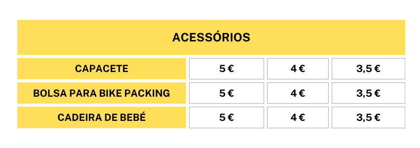 - As tarifas de aluguer das bicicletas e acessórios dependem do seu tempo de utilização.