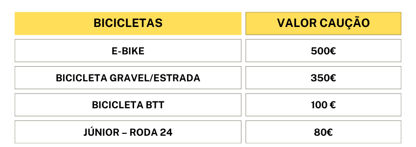 - A não devolução da bicicleta na data do término do contrato implica a perda total do valor de caução e o acerto da quantia em falta, para a total cobertura do valor da bicicleta.