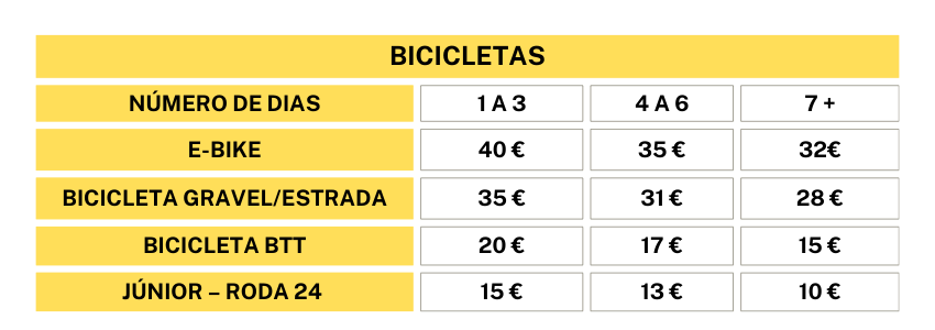 - O aluguer da bicicleta é reservado a maiores de 18 anos (ou menores desde que acompanhados por responsável de educação que presta termo de responsabilidade) desde que se apresente com documentação válida.